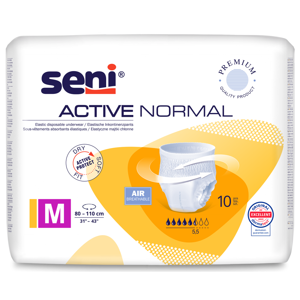 Одноразові поглинальні труси Seni Active Normal - це практичне рішення для людей, які ведуть активний спосіб життя та цінують непомітність і комфорт. Seni Active Normal захищають при помірному нетриманні сечі. Вони є еластичними і їх можна носити, як звичайну білизну. Вони також підходять для людей із хворобою Альцгеймера або іншими формами деменції, які відмовляються носити підгузки. Завдяки бічним бортикам та системою розподілу вологи (EDS) ефективно захищають від протікань.